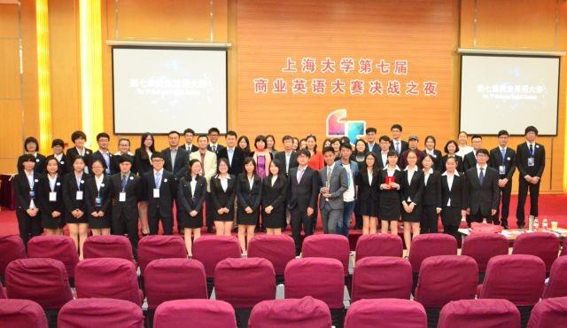 本届大赛立足时下经济热点,由“巨头跨界”的大主题贯穿初复决赛,由浅入深引导参与者思考当今风云变幻的商业生活。活动伊始,一段富有震撼力的视频带领大家简单回顾了本届商英大赛初赛、复赛时的点滴,并特别介绍了4支决赛团队的准备情况。比赛正式开始前,经济学院院长沈瑶老师上台致辞。他表示对于本届商业英语大赛寄予了高度关注,同时表示从07年创办至今已经成功举办七届,商业英语大赛给广大学生提供了展示和提升自我的平台,影响和激励了许多上大学子的成长。他还特别肯定和表扬了本届商英项目团队的工作和付出,同时也对进入决赛的4支队伍表示祝贺,并预祝他们在比赛中赛出风格,赛出水平。本次决赛要求每个团队在15分钟内进行“巨头跨界”的股东会模拟展示,并接受其他3队选手的提问。进入决赛的四支队伍The One、Roar、Aspirin和King of Chrysanthemum旗鼓相当,流利的英语表达和缜密的商业思维显示着他们不凡的实力。提问环节中选手间擦出的思维火花多次赢得观众掌声,评委们也都给予非常专业的点评。最终,经过评委们与大众评审的打分,决出了比赛的一、二等奖各一名,三等奖两名,并经过全场观众的投票选出了第七届商业英语大赛最具人气团队。Roar团队因其良好的精神风貌和表达能力赢得了评委和观众的一致好评,夺得亚军的同时斩获“最具人气团队”的称号。