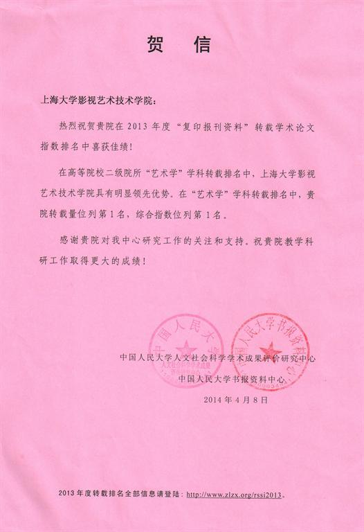 (上大影通社讯 齐伟供稿)日前,影视学院接到中国人民大学人文社会科学学术成果评价研究中心和书报资料中心联合发来的贺信,我院在2013年度“复印报刊资料”转载学术论文指数排名稳居全国第一。这已是我院连续第三年在全国位列榜首。