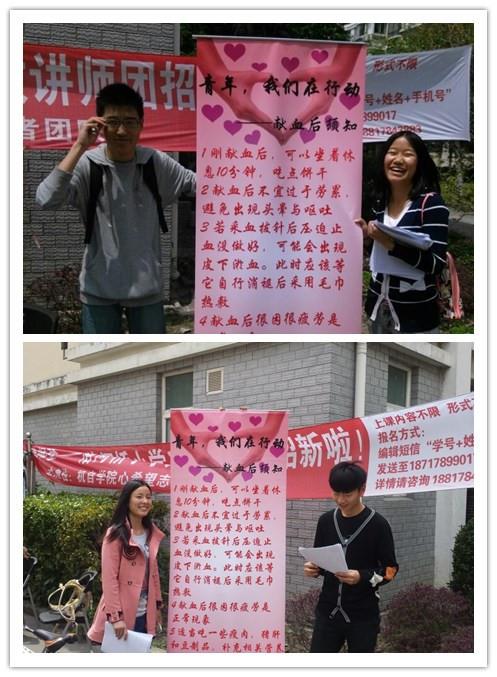 4月25日,信鸽社成员在永利集团88304官网宝山校区新世纪寝室楼7幢前宣传着献血前后的注意事项。尽管天气不好,但是前来咨询的人仍有很多。令人印象深刻的是,刚好有一名大一的同学献完血回来,手里拿着献血后的纪念品,信鸽社社员看见他似乎有点虚弱的样子,便走上前去,咨询他是否有不舒服的症状,他点了点头,这时社员就向他仔细讲述了献血后的注意事项。