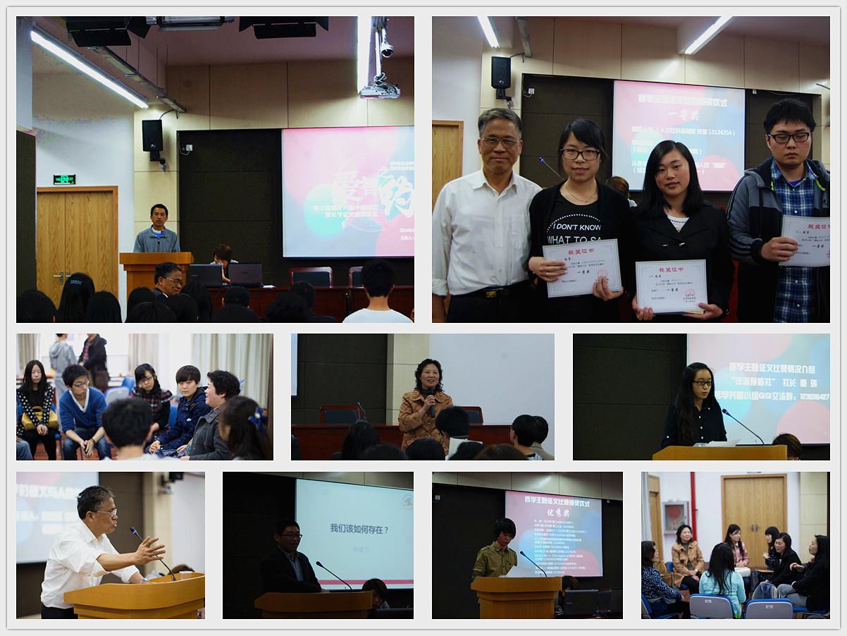 4月11日,社科学院第二届“爱智之约”哲学征文比赛颁奖暨哲学兴趣小组成立大会在新世纪大学村社区学院13幢2楼多功能厅顺利举行。活动由社科学院哲学系刘友古老师主持,哲学系陈新汉、宁莉娜教授等教师以及学院团委书记陆耀峰出席了本次活动,社科学院学生代表、第二届征文比赛部分参赛者、第三届哲学兴趣小组成员以及“泮溪爱智社”成员参加了本次活动。