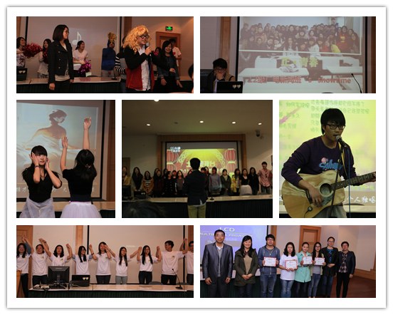 首先上场的12级会展班便为大赛打响了头炮,会展班的同学以吹拉弹唱跳等多种形式的表演给评委们带来一场热闹的“土豪春晚”,其后的班级介绍也体现出他们温馨的集体氛围。而12级编导艺术班也不甘示弱,充分发挥专业优势,来了一场别开生面的“开机秀”,又是令人眼前一亮。12级广播电视新闻班象征化整为零的“FM64.1”和数字媒体班的可爱昵称“树莓”都让人印象深刻。其后上场的12级广告班更是不走寻常路,这群Adman不仅在绩点上称霸,更以一曲《好汉歌》震慑全场,他们都来到台前热舞、向观众席抛洒糖果,赢得阵阵笑声。