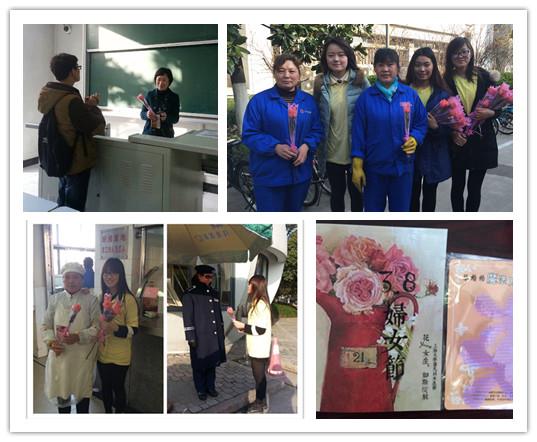 课堂上,老师们在收到鲜花后,既惊喜又感动,纷纷与可爱的“送花使者”合影留念,整个教室都散发着节日的愉悦气息。一句句“祝您节日快乐”,使老师们脸上洋溢起快乐的笑容。课堂外,还有平日里一直默默奉献的后勤工作人员们,“送花使者”们走进食堂、社区、武保处,给可敬可亲的阿姨们送上鲜花和贺卡,一声声“辛苦了”让她们在繁忙的工作中感受到了节日的温馨与幸福。鲜花虽小,却朵朵饱含着同学们对老师对阿姨们的感激之情,让节日里仍然奋战在工作一线的女教职工们感受到了节日的关怀,增进了彼此之间的情谊。朵朵鲜花看似相仿,送去的贺卡却针对不同的收卡人群依据她们不同的工作性质写上了不同的节日祝语,体贴温馨,使小小的贺卡有了更多的关怀和意义。