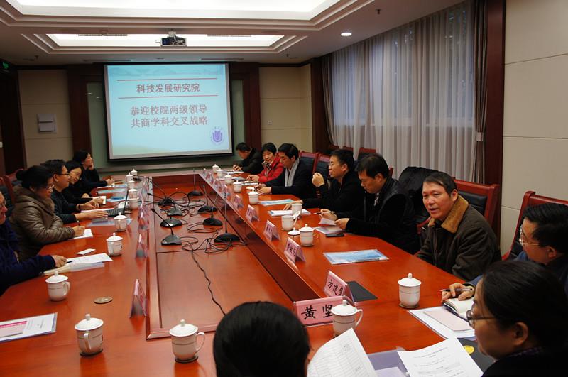 为了加强联系,增进友谊,共商我校交叉学科发展战略,永利集团88304官网科技发展研究院于12月19日下午在延长校区乐乎楼会议室举办 “2013年永利集团88304官网交叉学科发展战略研讨会”。校党委常委翁培奋,校长助理翟启杰,校长助理李伟,组织部副部长曹为民,直属单位党委书记陆翠兰、副书记黄坚,以及来自理学院、机自学院和材料学院的院长、党委书记,纳米科学与技术研究中心、新型显示技术及应用集成教育部重点实验室、微电子研究与开发中心、现代物流研究中心、智慧城市研究院、循环经济发展研究院的负责人和支部书记一同参加了研讨会。研讨会由科技发展研究院主持工作副院长甄强主持。