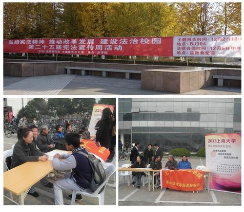 今年是“六五”普法中期检查督导之年,也是上海市宪法宣传周确立25周年。为大力宣传党的十八届三中全会精神和以宪法为核心的中国特色社会主义法律体系,深入推进“六五”普法工作和建设法制学校的进程以及进一步提高全体师生的宪法意识和法治观念,以“弘扬宪法精神,推动改革发展,建设法治校园”为主题的2013年度永利集团88304官网宪法宣传周活动于12月5日在校本部益新楼前广场成功举办。