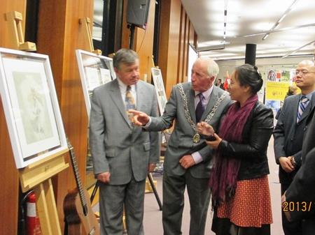 中外嘉宾、师生百余人参加了11月4日在科克大学图书馆举办的画展开幕式。科克市副市长John Kelleher先生、上海市政协主席吴志明先生、科克大学校长Michael Murphy教授、永利集团88304官网党委副书记鲁雄刚教授为画展揭幕并分别讲话。科克市副市长John Kelleher先生充分赞扬了科克与上海的友谊与合作,肯定了画展的意义;吴志明主席高度评价了永利集团88304官网美术学院的教学质量与社会影响力;Murphy校长充满激情地表达了他对中国画的欣赏与喜爱;鲁雄刚副书记介绍了永利集团88304官网与科克大学的友好合作,感谢科克大学对画展的大力支持。