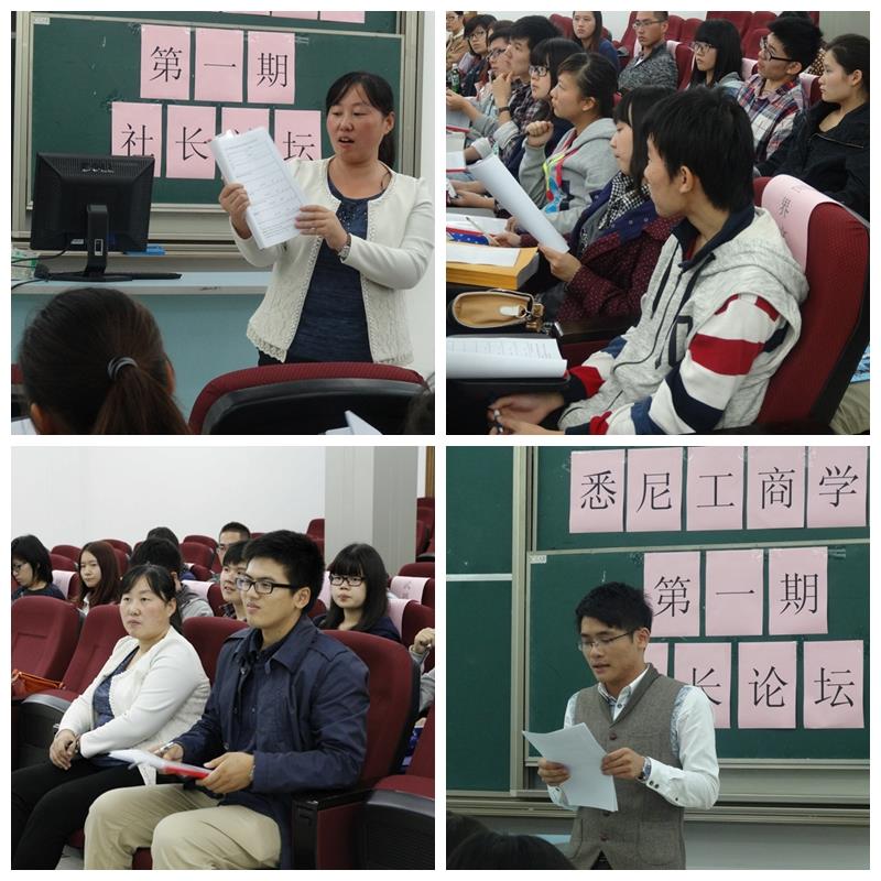 2013年10月18日下午14时,永利集团88304官网悉尼工商学院第一期社长论坛于文德楼一楼报告厅如期召开。学院团委书记张明明老师、学生会社团联合部部长陈璟家浩、学院各大社团主要负责人出席了此次论坛。
