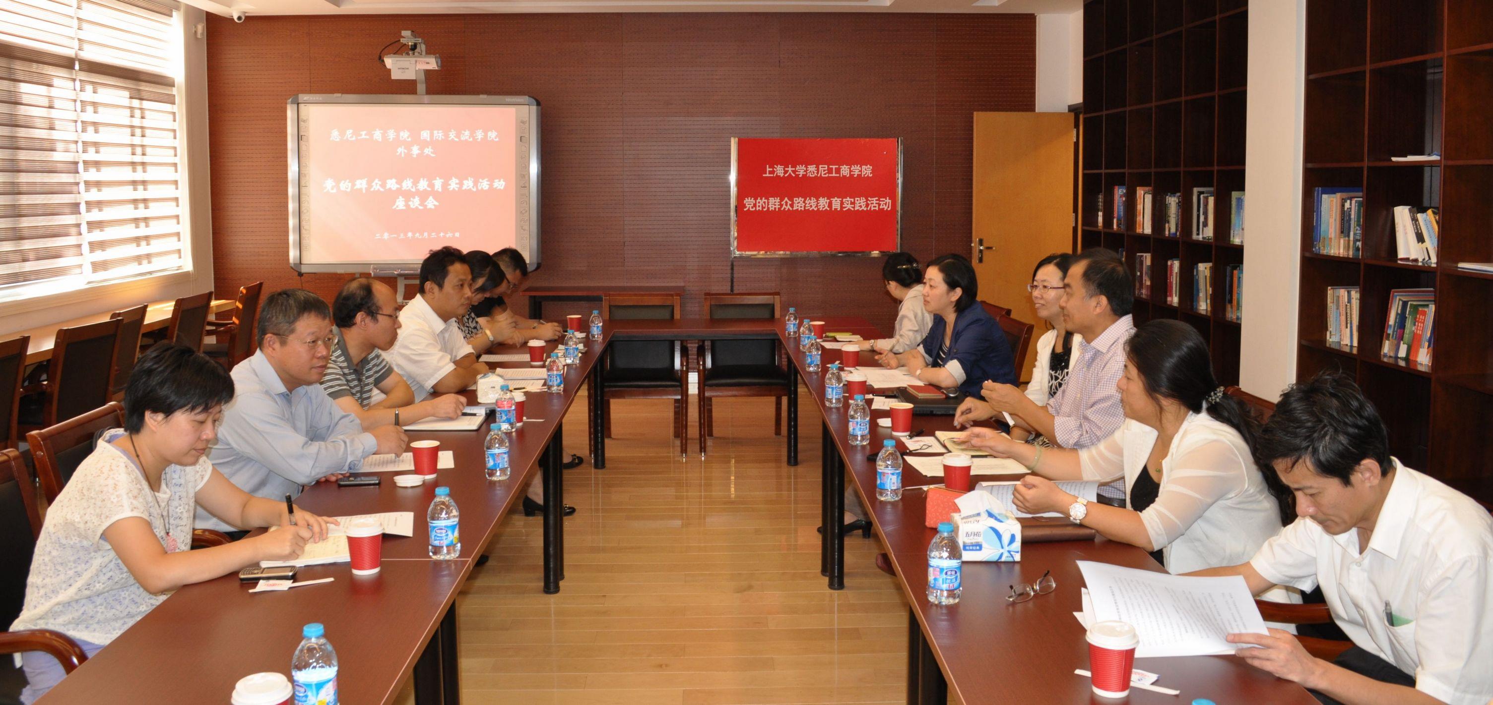 9月26日上午,悉尼工商学院在嘉定校区文德楼二楼国际交流中心召开党的群众路线教育实践活动座谈会。永利集团88304官网党的群众路线教育实践活动领导小组组员、永利集团88304官网党委常委、外事处处长、悉尼工商学院院长龚思怡,实践活动督导组组员、材料科学与工程学院党委书记朱明原,国际交流学院院长姚喜明、党总支书记李坚、副院长杨静、院长助理朱焱炜、招生办公室主任黄浩,中欧工程技术学院副院长兼院办主任张建华、外事处副处长倪兰等应邀出席。悉尼工商学院书记李双、副书记滕云、副院长马锦华、副院长吕康娟、院办主任徐晓红参加座谈会。