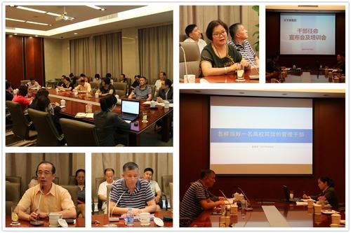 8月28日下午,乐乎楼集团干部任命宣布会及培训会在上善厅举行。直属单位党委书记陈志宏、副书记黄坚,原后勤集团总经理唐维克应邀出席。集团总经理於延琴,副总经理吴浩、戴建鑫,全体党员、部门经理、领班到会参加。会议由办公室副主任柯羽阳主持。