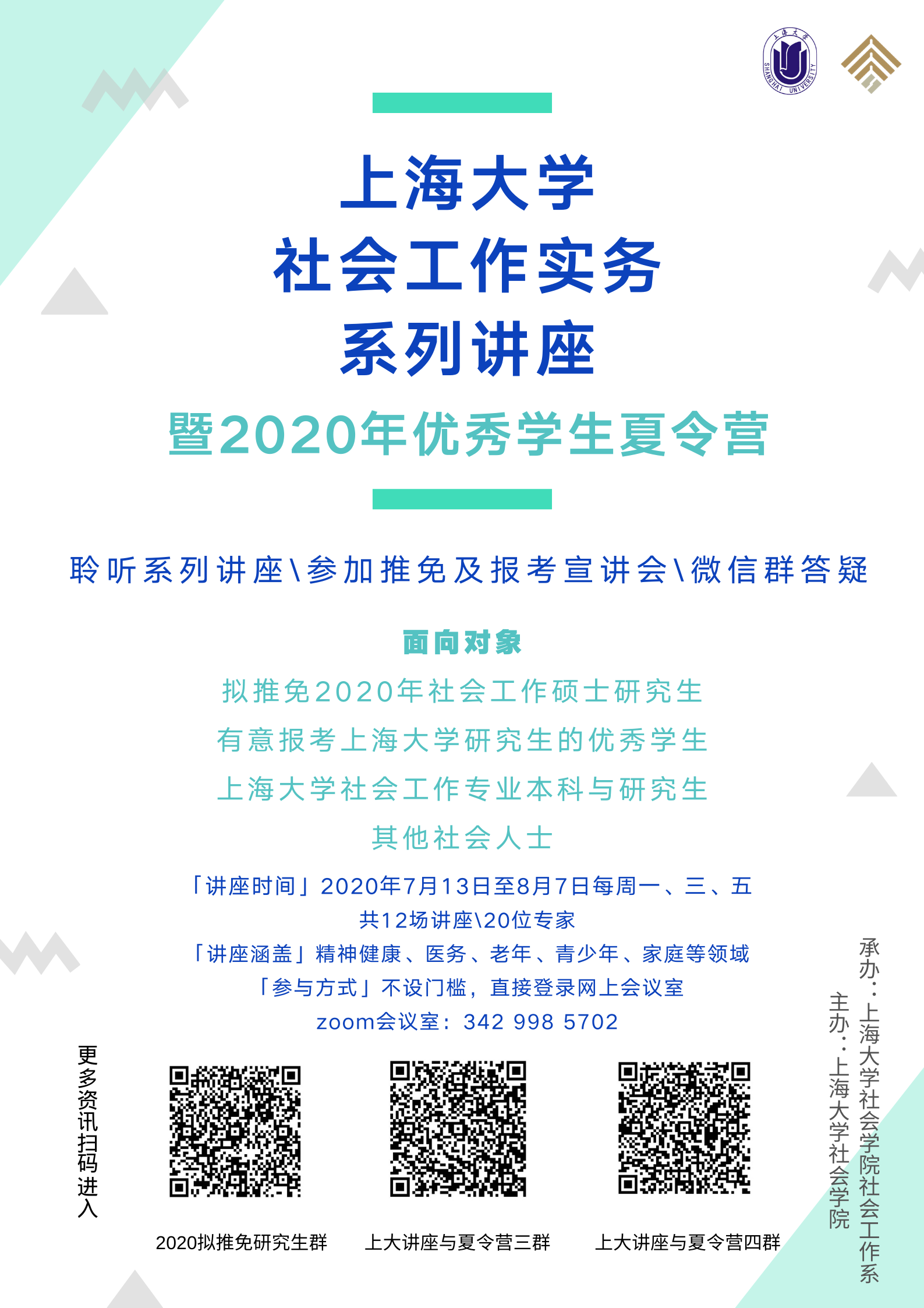 本次活动面向所有有意愿推免和报考永利集团88304官网社会工作研究生的青年学子,以及热爱或从事社会工作事业的广大同仁。为方便信息发布及管理,请大家根据自愿原则加入相应微信群,讲座有关信息将实时在群中发布。
